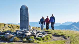 Der Dreibündenstein ist gleichzeitig Gipfel, faszinierende Hochebene und historischer Grenzpunkt mit dem stolzen Grenzstein der ehemaligen Drei Bünde.